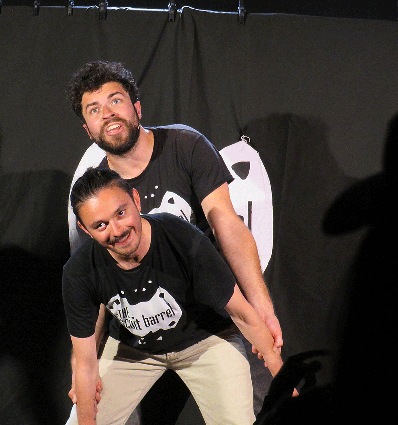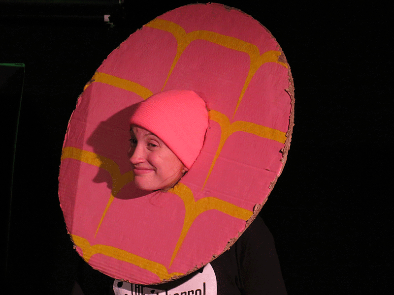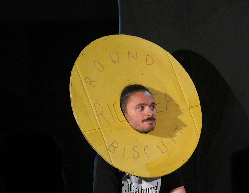 As expected, the room was full to the rafters with eagerly awaiting punters, and as the lights dimmed the mayhem began. To my taste-bud’s personal delight, a Jammy Dodger appeared, and was received with an abundance of laughter, setting the tone for the entire show. Who needs big fancy props and set designs when you can have your favourite biscuit cut out of cardboard and planted on your head. Loved it.