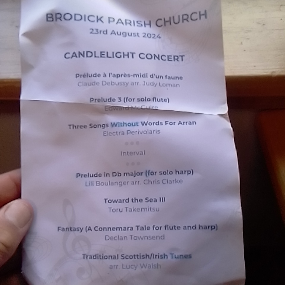 Electra Perivolaris, for example, from Whiting Bay, was given the task of being the festival’s official composer, & she’s created a piece to premiere last night for our two London-based, Guildhall School training, master musicians; flautist, Lucy Walsh , & harp player, Chris Clarke. Richard had noticed Lucy in recent years as a chief flautist in Berlin, & she was amazing, yeah. Her comrade’s playing, by the way, & his actual harp, were absolutely beautiful – but how Chris had successfully managed to get his instrument up from London, combating awkward Avanti West Coast train guards, & the ferry pedestrian ramp at Ardrossan, I’ll never know.