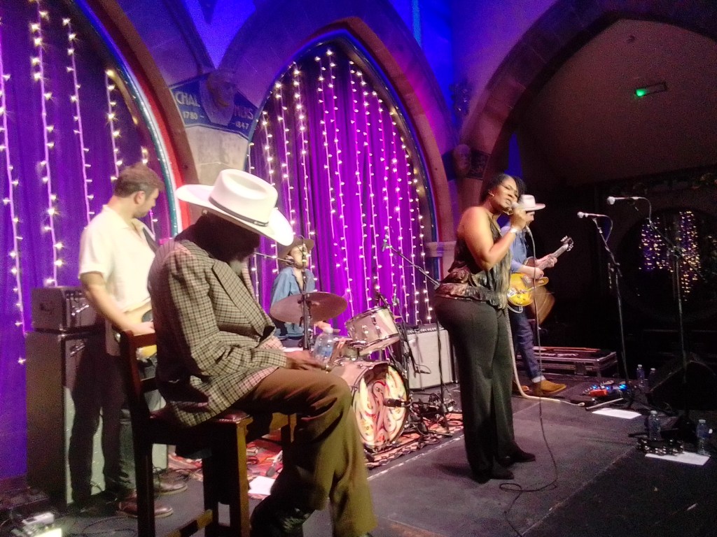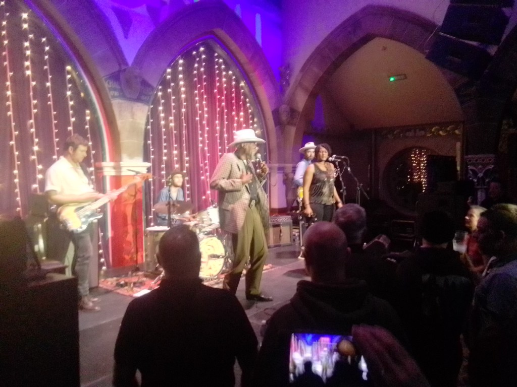 The bustling gig – the first of a short tour of the UK -, was upstairs at the Oran Mor, a gaudily decorated church of a space, like being in a medieval banquet on magic mushrooms, or summat. We were warm’d up for half an hour by Edinburgh-based soul & blues group, Jemmanuel, before Robert was led on stage by his eldest daughter, who would be tambourine-banging & singing backing, with a wee cameo centre-stage medley of her own towards the end of the set, including a stunning, ubersoulful, gemmy ‘Take Me to the River.’ Turns out both she & her daughter, Robert’s grand-daughter, sang on his last album, while this January they’ll all be singing on Robert’s new album, & also his daughter’s album. A real family affair, & there was an exceptional, yes familial, stage warmth to the event.