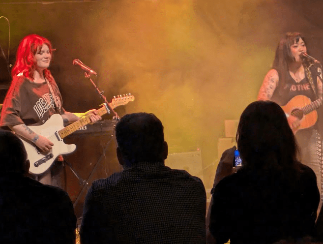 Coming from Glasgow, their debut album ‘Whiskey & Wine’ , released in 2023, gave us music with rare a style and presence. The band’s telecaster guitar was in the hands of some masterful playing, while the two front-girls shared vocals – solos and duos -, backed by this thumping rhythmic drum-beat, all fleshed out bypre-recorded bass, with both band and their audience having a great time.