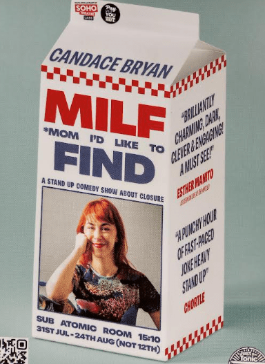Two years out from her delightful ‘Communist Dad’ show, Candace Bryan is back with another series of acerbic comedy maxims with her MILF: Mom I’d Like To Find. We’d all learned, thro’ her first show, about Bryan being the creation of her being rais’d by a single father; but in this sequel, of sorts, Bryan’s attention is turn’d to the relationship she had with the woman her gave birth to her at 17, & not long afterwards, gave up her natural parental responsibilities, & buggar’d off.