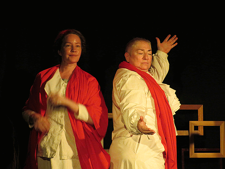 On an unusually hot Edinburgh summer’s day, it was a relief to be indoors and cool off, although the heat still remained via a serving of hot and spicy theatre. The show began… Bang! Alice and Gertrude were sitting calmly on their throne-like chairs. Dressed in white, like Angels descending from above, the impact was immediate. Like Lego bricks, the characters upon characters built up upon each other – how is this you ask? Well, with thirty characters it is no easy feat, but is achieved perfectly.