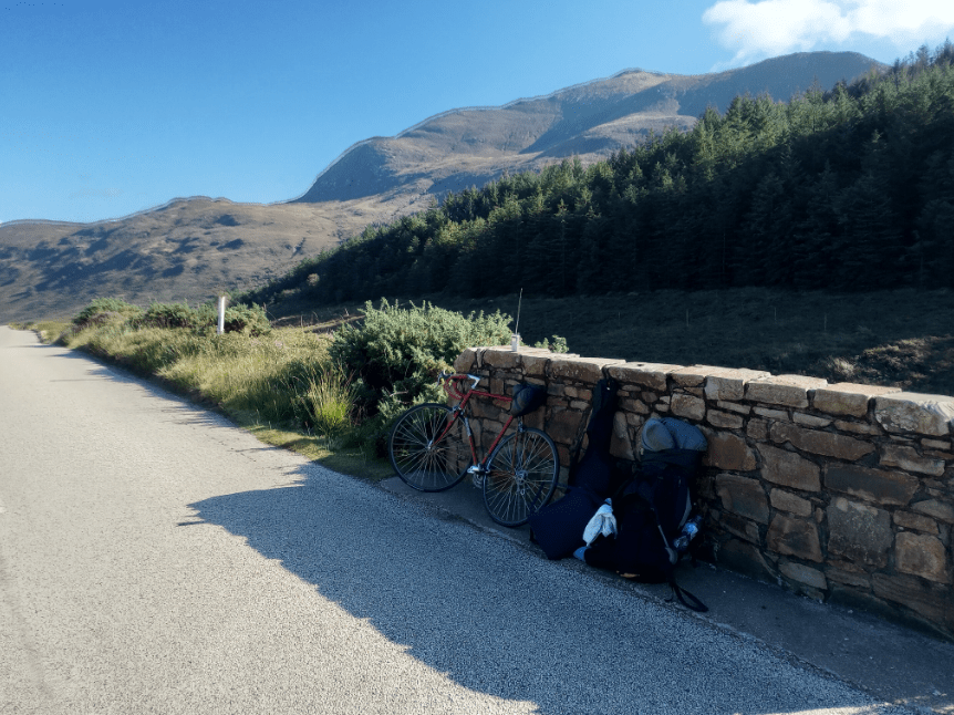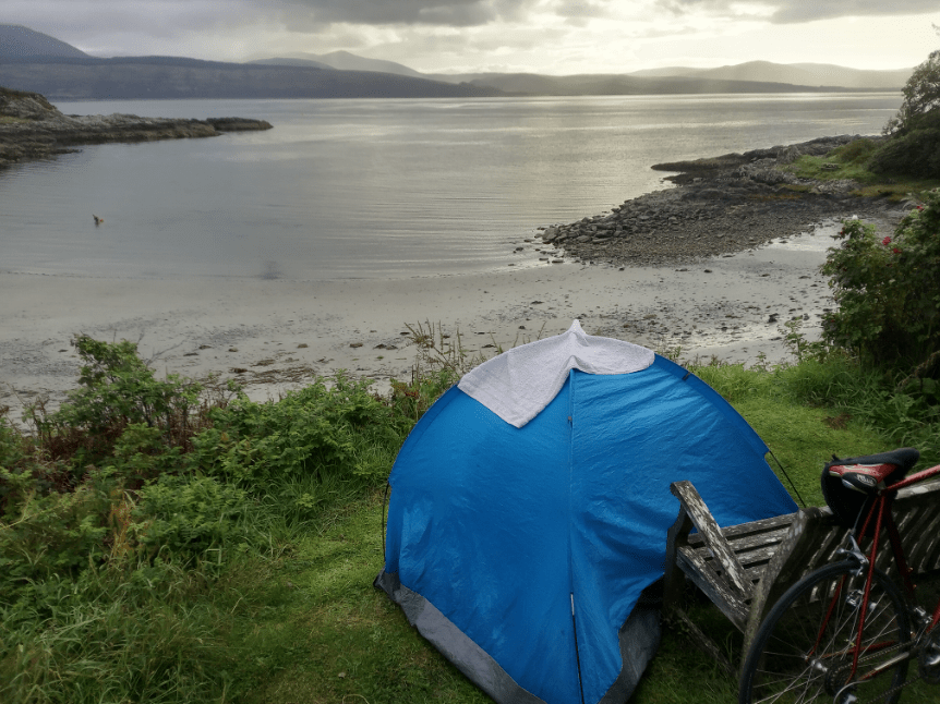 Reaching pretty Carradale, & grabbing a couple of packets of crisps from the Glen pub, plus filling up my water bottle, I proceeded to the clifftop hamlet of Port Righ, overlooking a compact & gorgeous bay, where a small ledge & a bench proved to be my first camping spot of the tour. The stars were scintillating in a clear night sky, which meant the temperature dropped to 4 degrees & I realised I might have under-estimated the bedding I’d need for at least the Scottish part of the tour.
