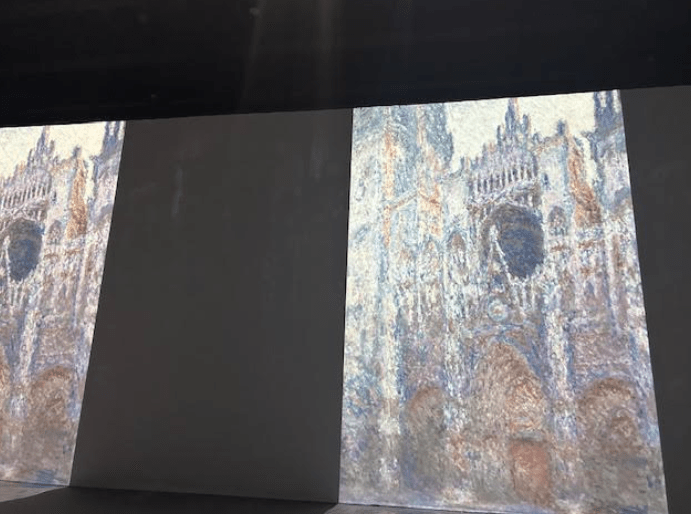 In a room big enough to build a space rocket there was no art hung on the wall but everything was covered, there were two high pillars square with light and shadow shapes that forever moved. The whole room in fact moved but only in sensation as we were kind of taken out of fact. But this didn’t mean Monet’s facts were lost, far from it they were submerged in this tidy immersive experience.